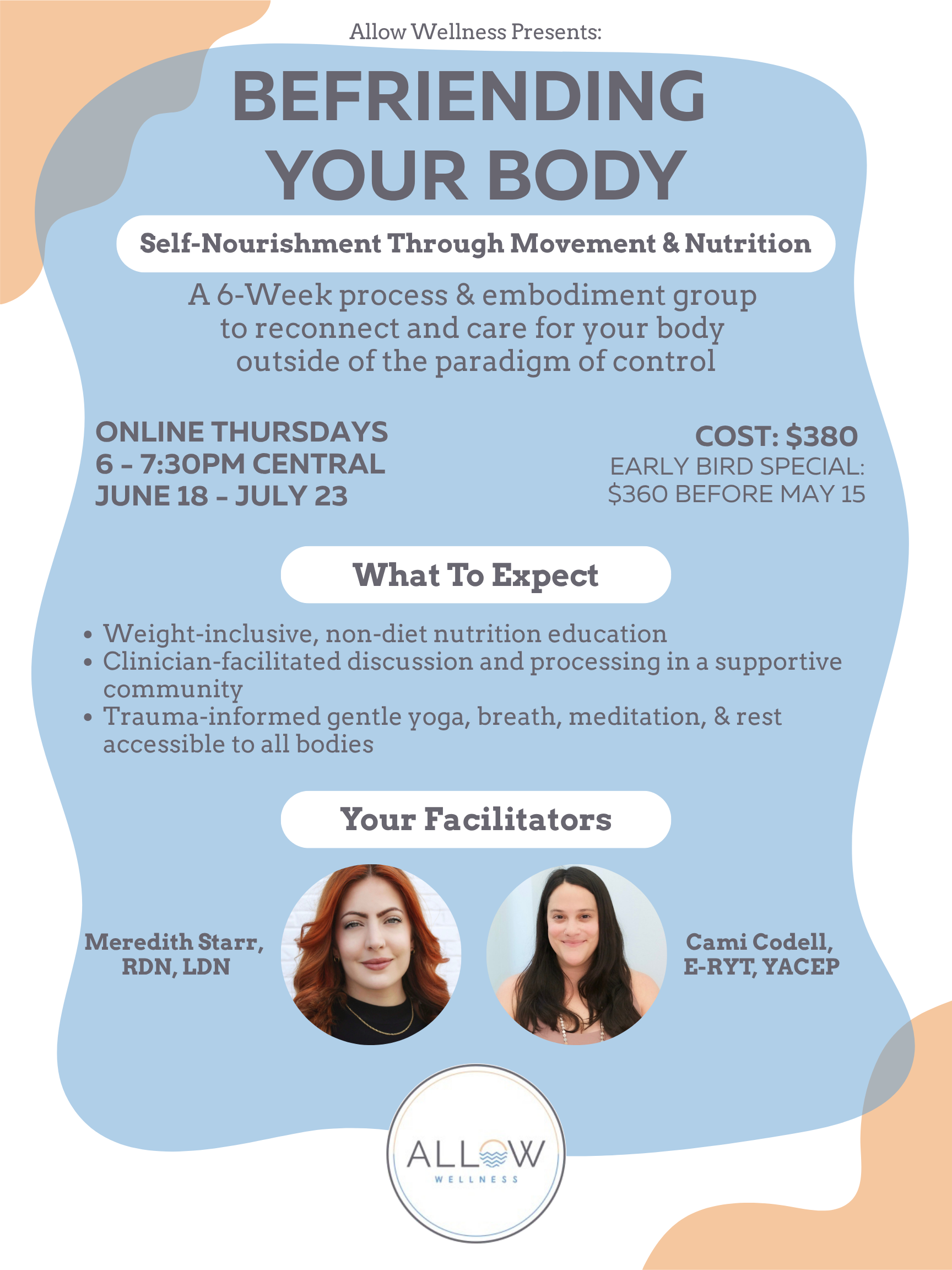 If this resonates with you, join us for a 6-week group to reconnect and care for your body outside of the paradigm of control. Email Meredith at mstarr@allow-wellness.com or book online to register.